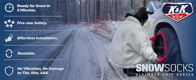 K&K Auto Accessories Snow Socks for Tires - Pro Series for Ultimate Grip Alternative for Tire Snow Chain - Snow Traction Device for Passenger Cars SUVs Trucks Winter Emergency Accessory (XX-Large)
