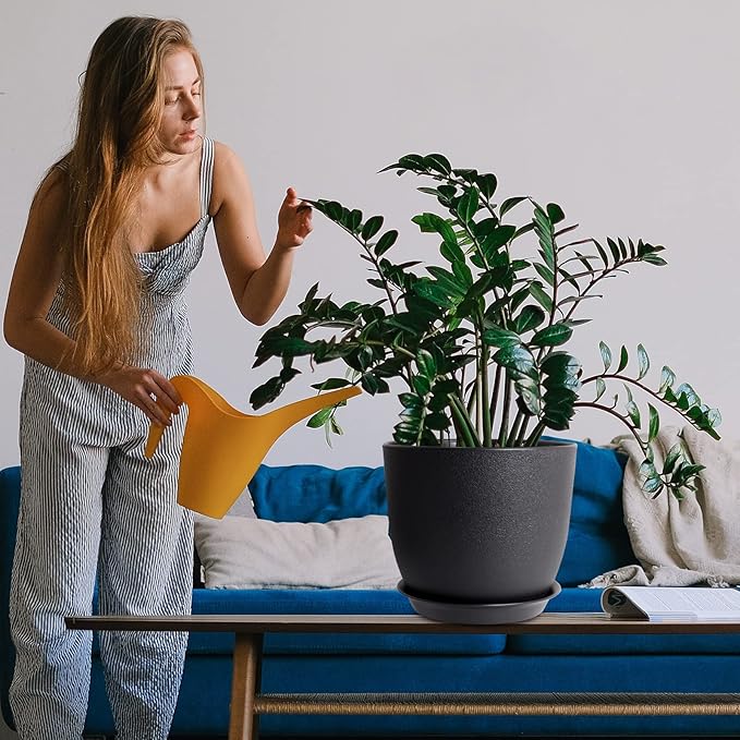 WOUSIWER Plant Pots 10/9/8 inch, Set of 3 Modern Decorative Plastic Planters with Drainage Holes and Saucers for House Plants Indoor Flowers Plants, Black