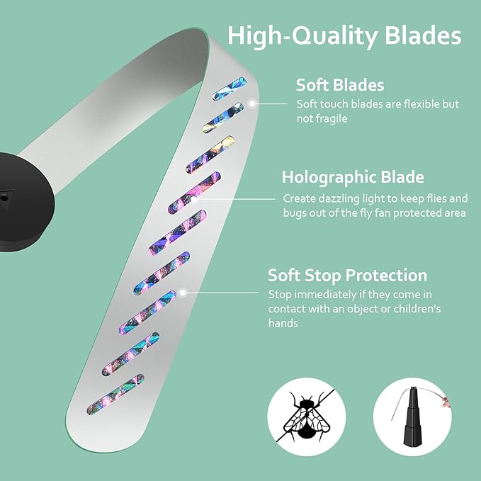 - 【Soft Blades & Instant Stop】The blades are made of soft-touch and high-quality material, and specially designed to instantly stop when they contact any other objects, and rework once the objects move away. Unlike some of the other fly killer, you don't have to worry about flies repellent fan causing injury to you or your child, pets.
