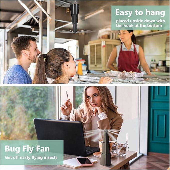 - 【Portable & Noiseless】With compact size and lightweight, the fly deterrent fans for table can be easily carried to any indoor or outdoors place. You can place the outdoor fly fans on a table or hang it anywhere if needed. The blades rotate at a constant speed to keep the air clean, but do not produce any disturbing sounds. You can enjoy a quiet meal time without any other buzzing flies!