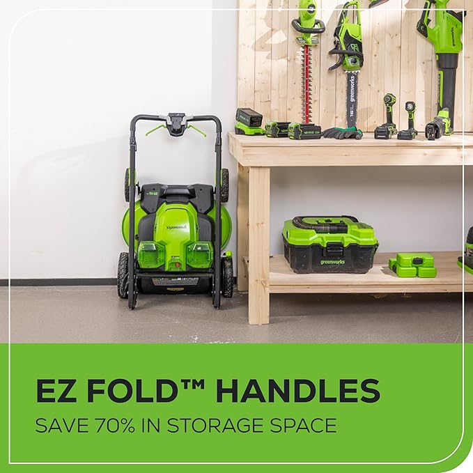 - MAINTENANCE FREE – This self-propelled lawn mower is virtually maintenance free, with no gas, no oil, and no emissions. Push button start, quiet operation, and delivers gas-like performance. Use up to 70% less space in your garage with vertical storage.