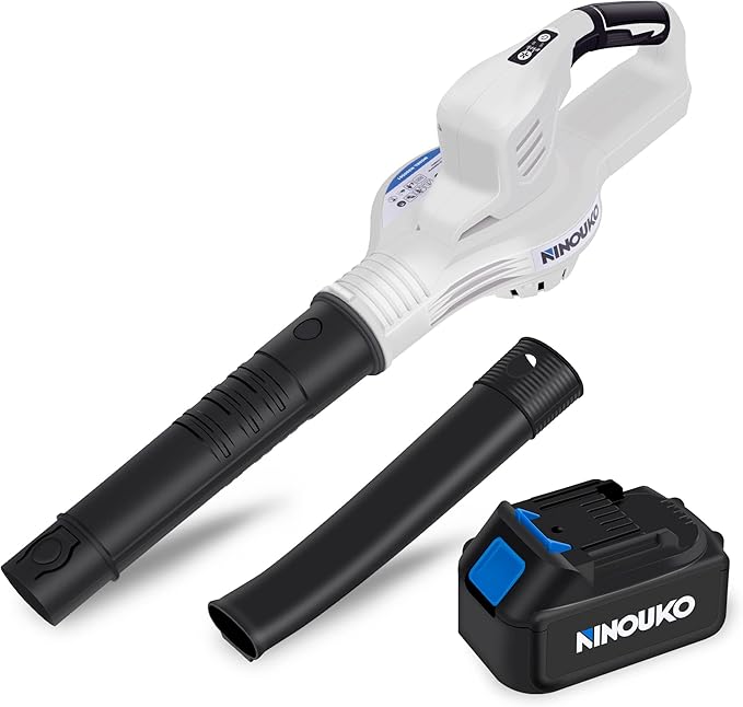 - 【Energy-efficient and Powerful Motor】- NINOUKO leaf blower is propelled by an upgraded brushless motor with advanced turbo tech that produces up to 150mph air velocity. The 20V motor is more compact and much quieter than non-cordless models, and able to generate higher torque from less energy consumption while saving you from repeated maintenance.