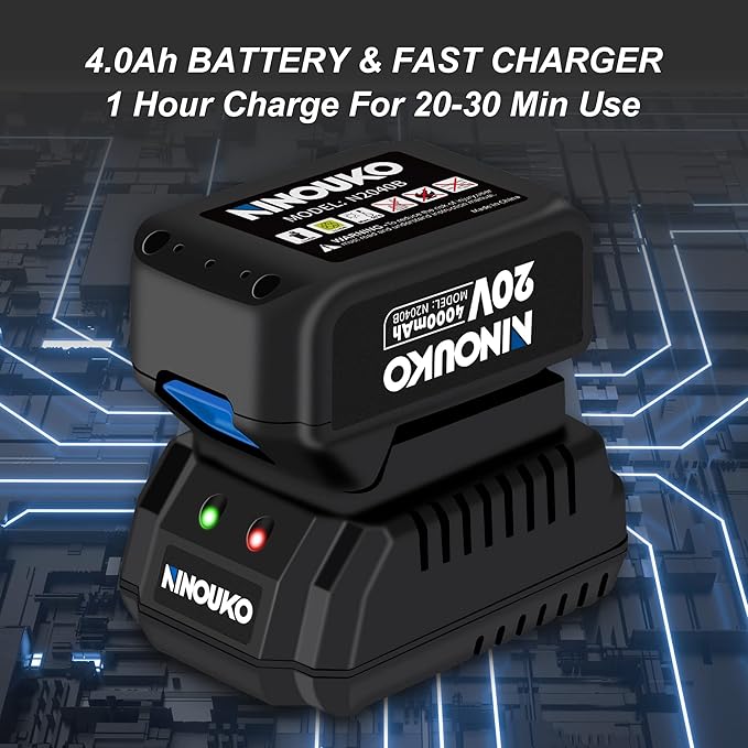 - 【Two Gears and Fast Charge】 - Easily switch between 2 gears(100mph and 150mph), depending on the task you want to do. With NINOUKO leaf blower you get 4.0ah 20v battery that will fully charge in only 1 hour (please do not charge more than 5h at a time).