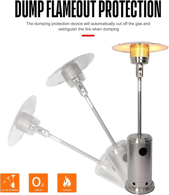 - Safety Guarantees: CE and ETL certified guaranteeing its safety. What’ more, the auto-shut off protection ensures that the patio heater will automatically stop working if the tilt angle is over 30°. In a normal situation, with the extra weight of the 20 lbs gas tank, the heater will not be knocked down easily, please use with confident.