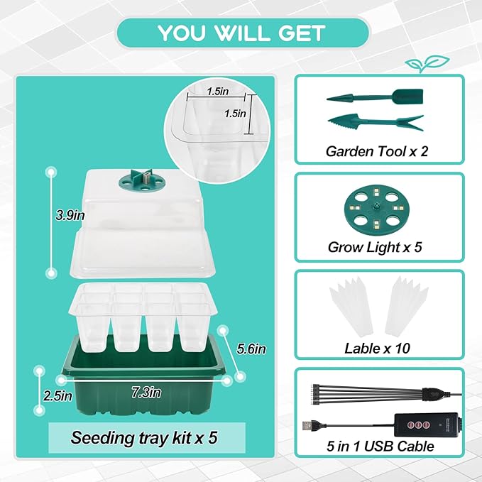 - π±[Versatile use & Value Package]-The seed starting kit package includes: 5 x Seed Trays (12 cells per tray, total 60 cells), 5 x Humidity Dome, 5 x Plant Grow Lights(8 LEDs per light), 5 x Base Tray, 10 x Plastic Plant Labels, 2 x Plant Tools, 1x extended(6ft) 5 in 1 type c cable with the smart control system. Perfect for various plant seedlings, such as vegetables, strawberries, flowers, fruits, etc.