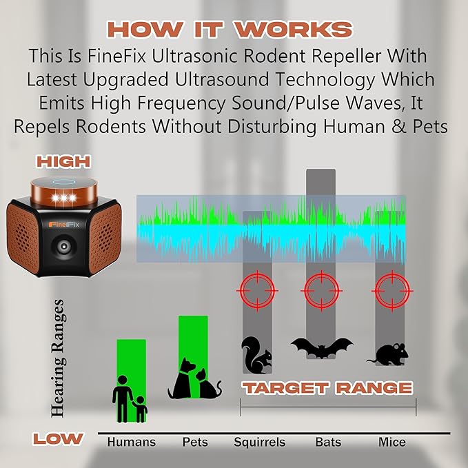 - WIDE COVERAGE FOR PEST PROTECTION: Protect your home effortlessly with our one of the best ultrasonic rodent repellent ultrasonic plug in ultrasonic rodent repeller indoor which has a wide range of 1290 sq ft at 360Β°. This is a modern mouse ultrasonic repellent indoor, emits targetted frequency sound waves that deter rodents without harming them, creating a safe environment for your family & Pets. This ultrasonic squirrel repeller attic is one of the best deterrent for rats as well.