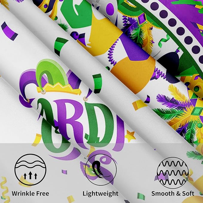 - 【SIZE & FEATURES】: This Mardi Gras party tablecloth has a diameter of 60 inches and will fit a table of stand size. It features a spill-resistant fabric that protects your table and furniture from liquid, scratches, stains and sun ray.