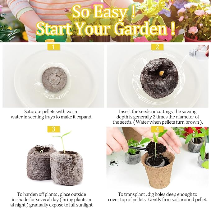 - Wide Application: Seeds starter pellets are great for starting your veggies, garden plants indoors or outdoors, such as tomatoes, peppers, evening primrose, making your seedling work easier and lower cost; You can also plant it with your kids, especially for gardening and growing enthusiasts
