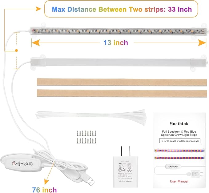 - Easy Installation with total Mounting Kits for Plant Shelf or Under Cabinet - The grow light bar set comes with 8 screws , 2 double-sided tapes and 6 ties. Compact design fits for various fixtures and surfaces. The power cord is 78 inches long for easy using in office,home,plant shelf, indoor greenhouse etc