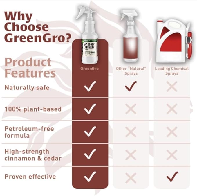 - POWERFUL ALL-NATURAL FORMULA: GreenGro Rodent Repellent features a potent blend of all-natural ingredients, sourced in the United States, to effectively keep away rodents. The primary agents - cinnamon oil & cedar oil - overwhelm the senses and deter rodents like mice, squirrels, and rats.