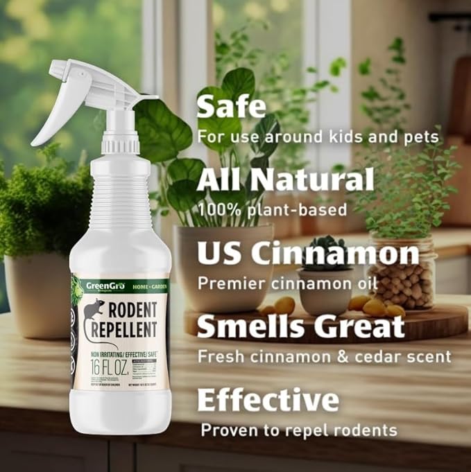 GreenGro Rodent Repellent Spray - Organic Cedar & Cinnamon Oil for Pest Control/Mice, Rat, Vole & Squirrel Repellent/Non-Toxic/Safe for Pets/Use for Home, Garden, Garage, RVs (16oz)