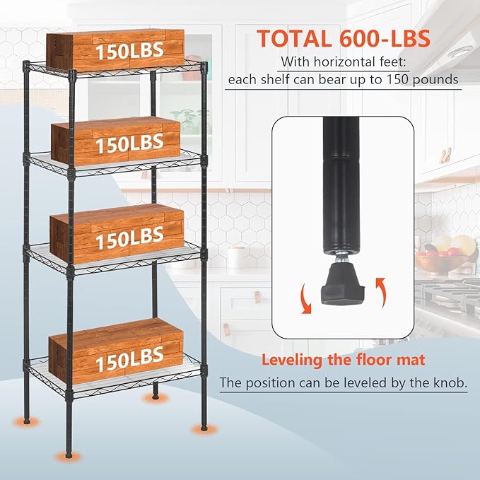 - ✔【STRONG WEIGHT CAPACITY】 Each shelving can hold 150 pounds (evenly distributed), and the total maximum load weight of the storage shelves for small places is 600 pounds. The shelves for storage for kitchen can put some commonly used living objects on it without worrying about the deformation of the storage shelves.