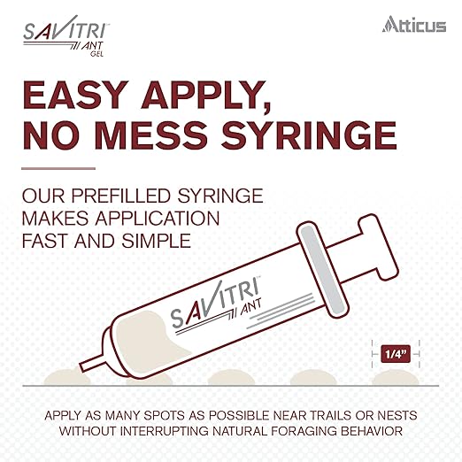 - EASY APPLY, EASY CONTROL: Our prefilled syringe makes easy work of ant control. Simply dispense gel in a thin line or as spots near the ant trail or nest site. After application, check bait sites and reapply as consumed. Savitri leaves no residue, no odor, and of course, no ants.