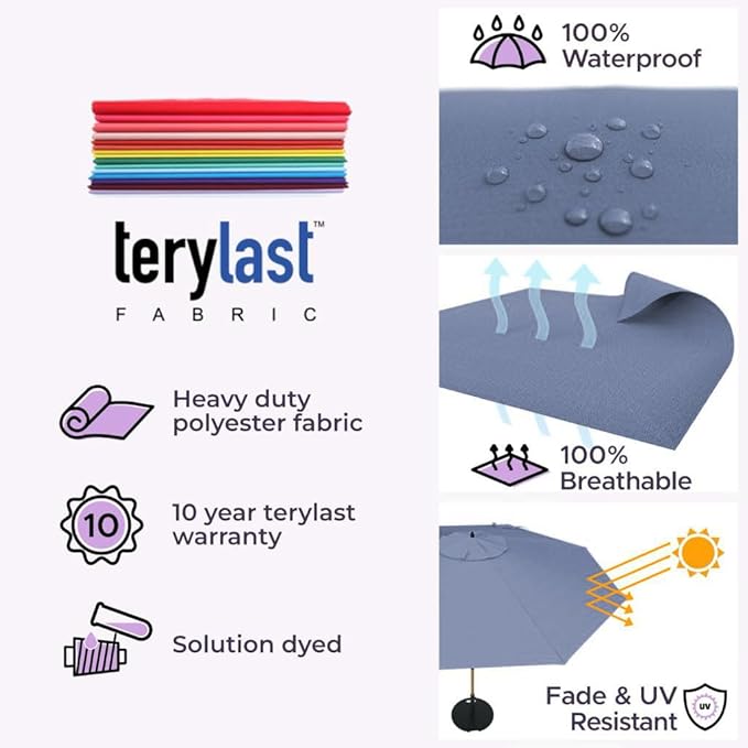 - Intelligent Design: Aluminum Pole: We donโt use rusting iron or steel! This pool umbrella has a thick 2.5mm wall that is rustproof and weather resistant that will provide peace of mind even under rainy weather. Both Terylast or Sunbrella fabrics are waterproof and solution dyed for optimal fade resistance under the beaming sun.