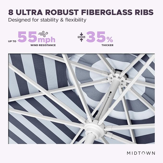 Midtown Umbrellas The Swilt 10 Feet Patio Umbrella in Terylast Navy Stripes (Navy/White) Polyester Fabric - Fiberglass Ribs, Auto-Tilt Aluminum Frame For Backyard, Deck, Garden, Pool - White Pole
