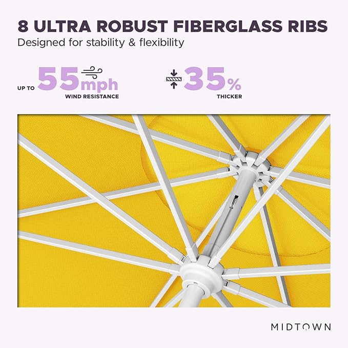 Midtown Umbrellas The Swilt 8 Feet Patio Umbrella in Terylast Sunflower (Yellow) Polyester Fabric - Fiberglass Ribs, Auto-Tilt Aluminum Frame For Backyard, Deck, Garden, Pool - White Pole