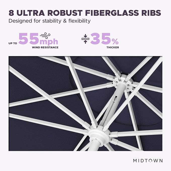 Midtown Umbrellas The Swilt 9 Feet Patio Umbrella in Terylast Navy (Navy Blue) Polyester Fabric - Fiberglass Ribs, Auto-Tilt Aluminum Frame For Backyard, Deck, Garden, Pool - White Pole