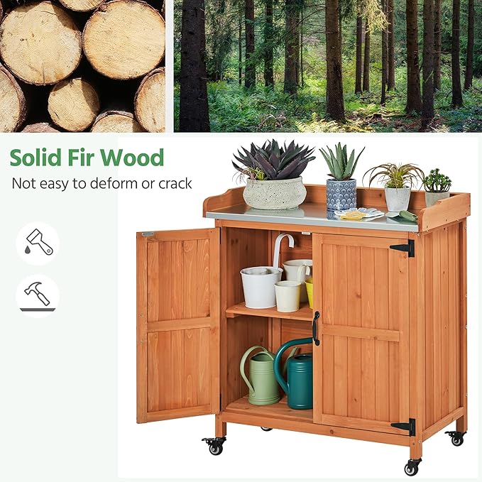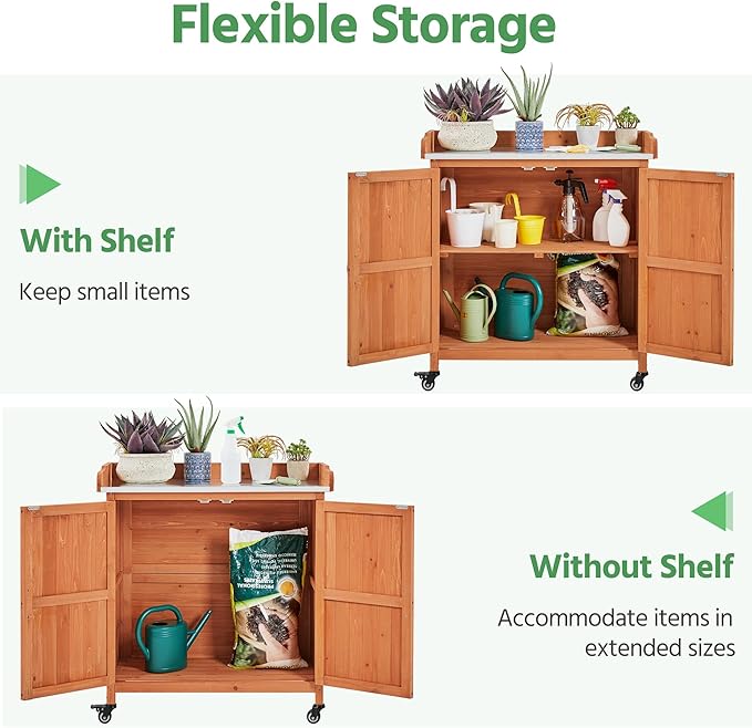 Yaheetech Garden Potting Bench Table - Outdoor Garden Patio Wooden Storage Cabinet & Solid Wood Planting Work Bench with Large Space Storage & Metal-Plated Tabletop, Brown