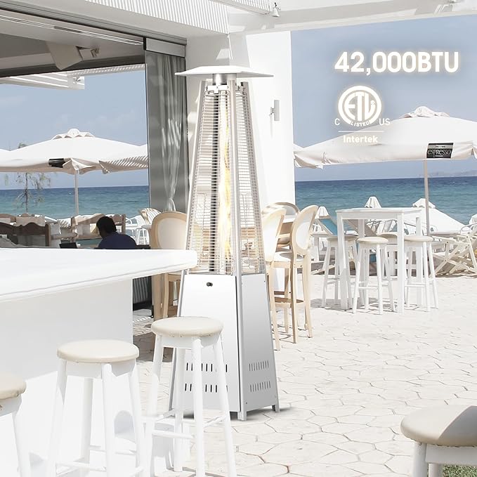 Pyramid Patio Heater 42,000 BTU, Propane Outdoor Heater with Glass Tube and Wheels, Patio Heater with Protection System, Stainless Steel, Suitable for Outdoor Commercial & Residential Use, Silver