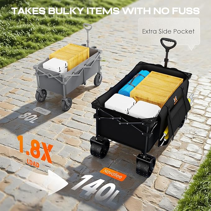 - EXCELLENT ADDITIONAL PERFORMANCE : Our side pocket will give you way additional storage capacity than other wagons. You can put the umbrella or camping gear in it. It has two mesh cup holders to keep your drinks upright during transport. The ergonomic shape of the handle is for easier pulling and hauling to reduce labor that allows for smooth control. Our great value wagons are sure to serve you for many years and make your companion in your outdoor life.