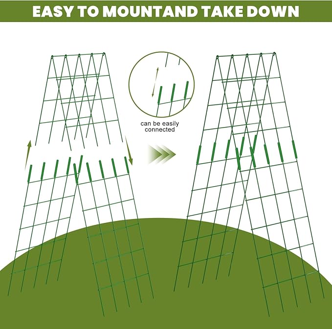 - 【STABLE DESIGN】 The trellis features A-frame and foldable designs, which allow plants to get sunshine evenly and helps them grow healthily. Plus, using this foldable trellis is easy to expand the extra space you want or convenient to store for next growing season. The bottom can be deeply inserted into the soil for more stability.