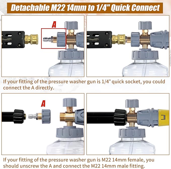 - MULTIPLE CONNECTION METHODS: Snow foam cannon has a detachable 1/4 Inch Quick Connector. If your fitting of the pressure washer gun is a 1/4'' quick socket, you could connect 1/4 Inch Quick Connector of pressure washer foam cannon directly; If your fitting of the pressure washer gun is M22 14mm female, you should unscrew 1/4 Inch Quick Connector of power washer foam cannon and connect the M22 14mm male fitting. Unique and convenient connection methods to meet the different needs of your life
