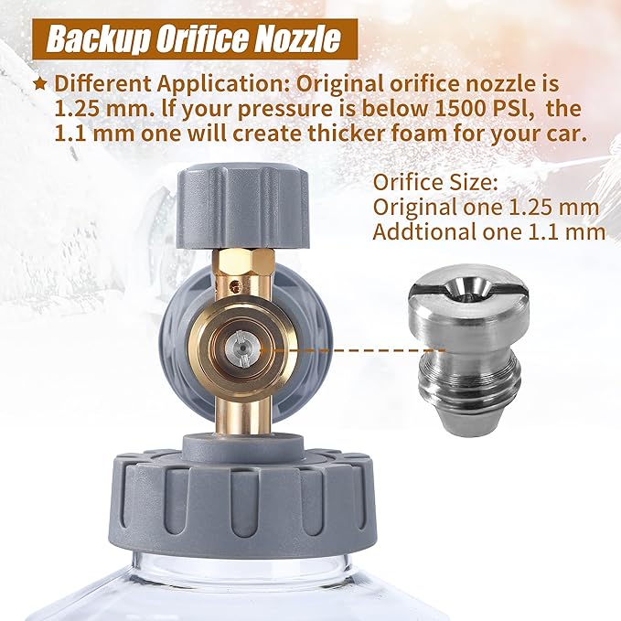 - ADDITIONAL ORIFICE NOZZLE: Foam cannon for pressure washers has an alternate foam cannon orifice nozzle of 1.1 mm. You can use a 1.1mm orifice nozzle when your pressure is below 1500 PSI . Because foam cannon orifice 1.1mm creates thicker foam; If your pressure is over 1500 PSI, please use the original nozzle