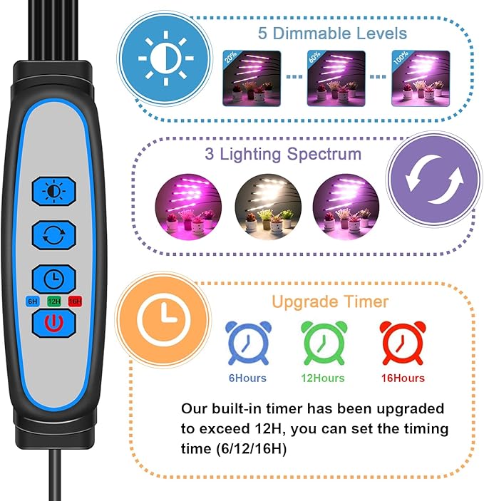 - [Upgraded Timer 6 12 16H] This grow light has a new upgraded timer, we can set the time to 6 12 16H. Through research, most plant lights on the market do not exceed 12 hours, 16H is more suitable for your plant growth. According to your setting, it will turn on and off automatically every day