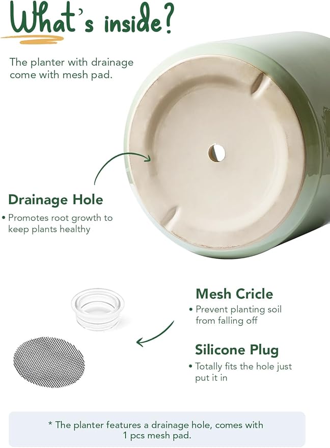 - Silicon Plug, Drainage Hole, Net Included: To drain or not to drain, it's all up to you; Roots love moisture but are afraid of excessive water; Use a silicon plug to prevent water leakage, or cover the drainage hole with a mesh pad to prevent soil loss, offering good ventilation for plants to breathe freely (Plant is Not Included)
