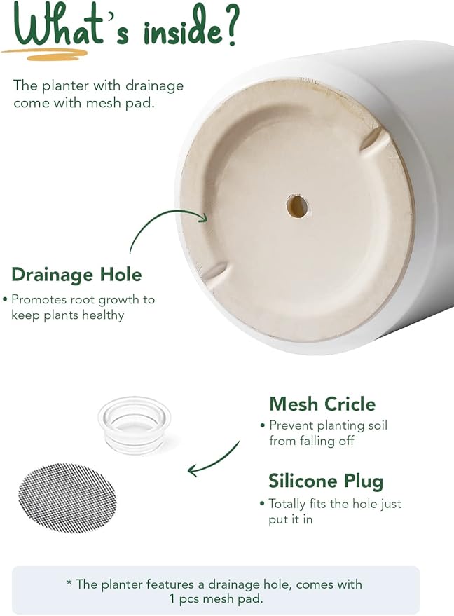 - Silicon Plug, Drainage Hole, Net Included: To drain or not to drain, it's all up to you; Roots love moisture but are afraid of excessive water; Use a silicon plug to prevent water leakage, or cover the drainage hole with a mesh pad to prevent soil loss, offering good ventilation for plants to breathe freely (Plant is not included)