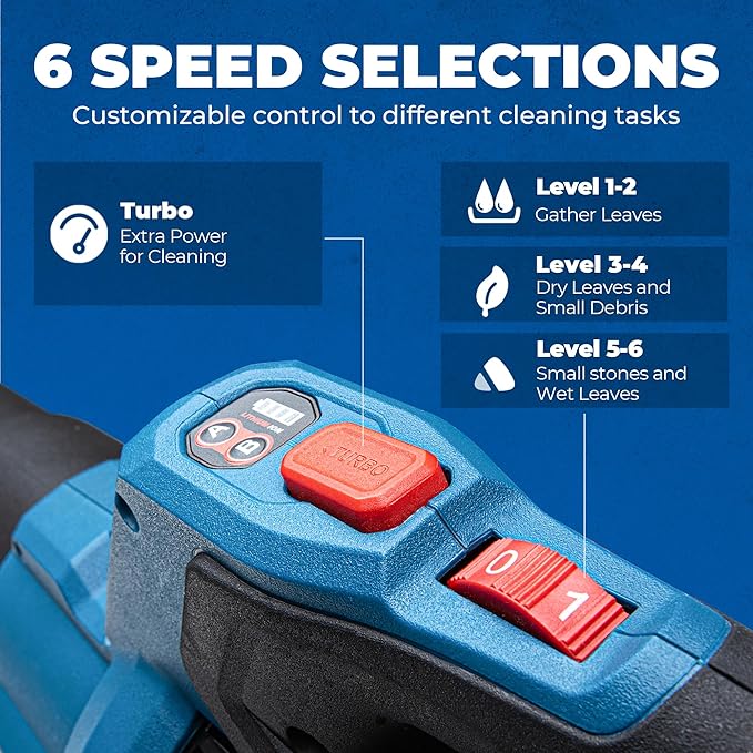 - 【6 Variable Speed】Our cordless leaf blower can provide you with 6 adjustable speeds, up to 140 MPH, which can help you easily switch from outdoor to indoor work for all scenarios. With our leaf blower, you can tackle your outdoor cleaning with ease and confidence.