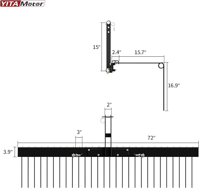 YITAMOTOR 72 Inch Durable Powder Coated Steel Pine Straw Rake Steel Spring Landscape Rake Attaches to Cat 0 Cat 1,3 Point Hitch for Tractor, Black Grey