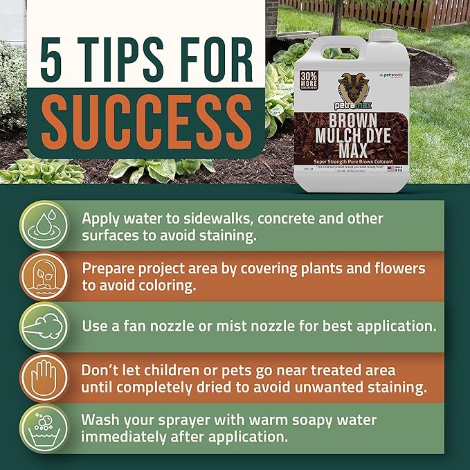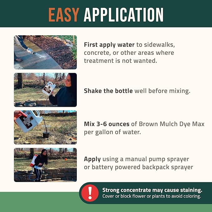- COUNTRY CLUB QUALITY: Used on golf courses and country clubs around the US, our mulch dye brings that professionally manicured landscape feeling to your yard. The rich brown color makes your mulch look brand new, year-round!