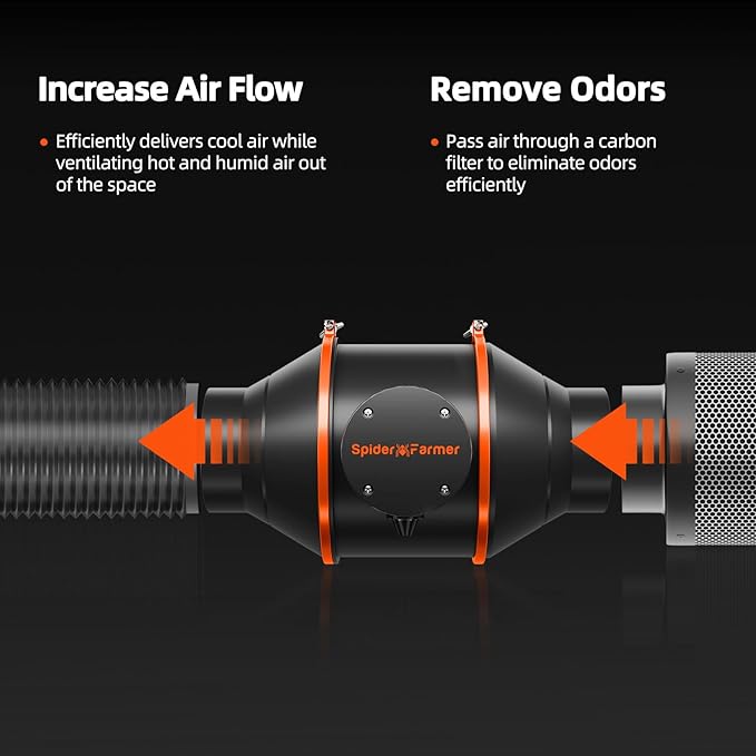 - POWERFUL VENTILATION SYSTEM: Quiet and low noise (26.8 dB) 4” Inline fan 205 CFM airflow with RC412 activated carbon filter and flexible duct. Provides excellent air circulation and eliminates odors. Clip fan delivers airflow ranging from 0 to 2500 RPM, flexible rotation quick circulation cooling, and customizable 10 speeds for all plant growth stages