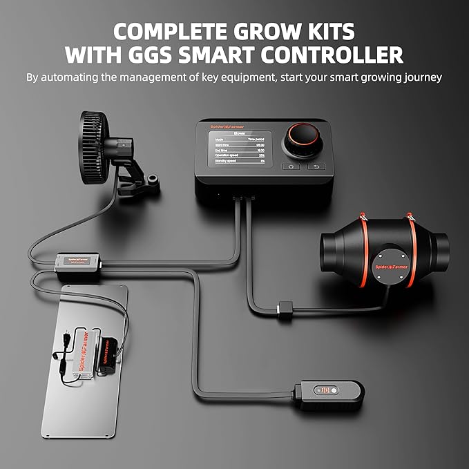 - SMART ENVIRONMENTAL CONTROLLER: It integrates with various monitoring devices, including temp/humidity/light sensors, and is managed via the Spider Farmer app or manually operated. You can easily customize the light with 0%-100% dimming, grow cycles timer on/off schedule, adjust inline fan speed control over airflow, clip fan running speed & oscillating head angle. Ensures your plants thrive under optimal conditions