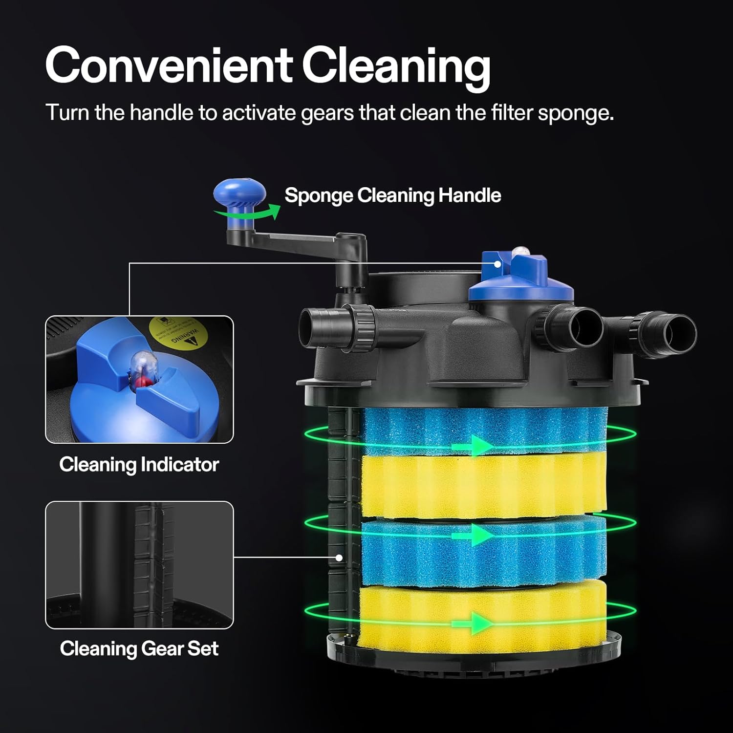 - Powerful Filter: Compared with a traditional gravity filter our filter has lower energy consumption and high efficiency, removing suspended matter in the pond more effectively; The maximum flow-through of the pond filter system is up to 1580GPH (6000L/H), suitable for decorative ponds under 1600 Gallons and fish ponds under 800 Gallons