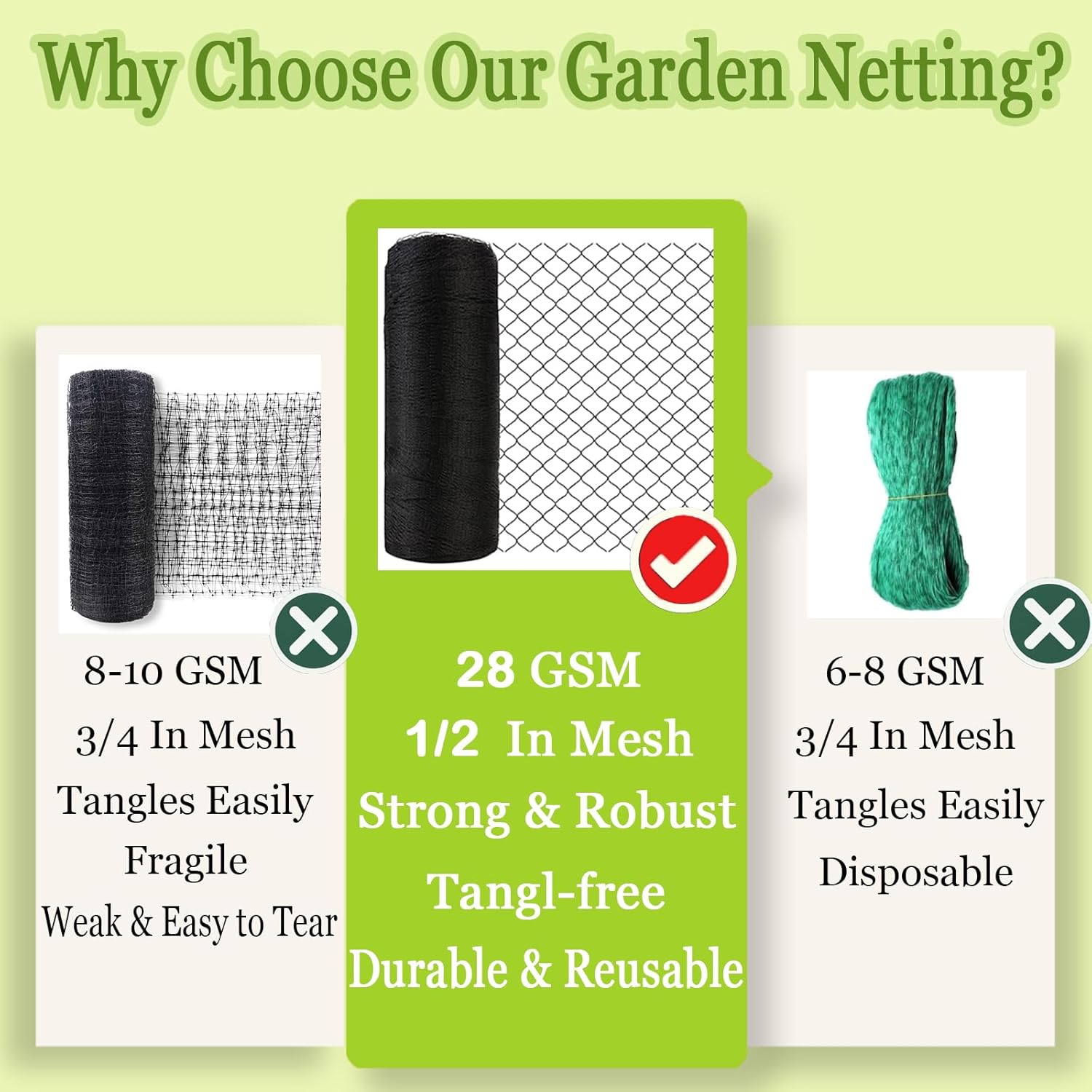 - Netting for Garden Protection: Our bird netting for garden is designed to protect your plants, fruit trees, and vegetables from birds, deer, squirrels, rabbits, and other animals. Lightweight yet strong, this garden netting resists tearing and damage from squirrels and other small animals