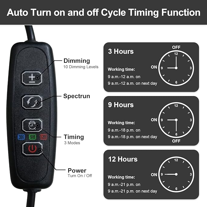 - Cycle Memory Timer: Set it once, the grow light will automatically turn off for 3/9/12 hours at the same time every day.