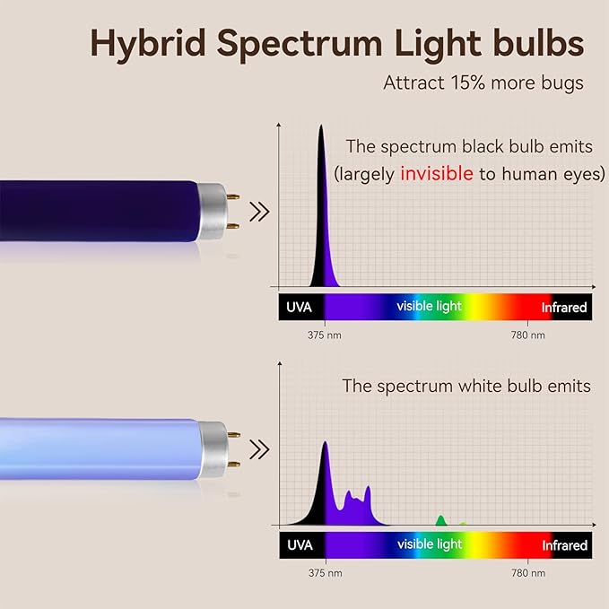 - 【🌈 Broader Spectrum】Hybrid regular UV and black UV dual bulbs emit broader light spectrum is more effective to attract bugs. (Black UV light spectrum is largely invisible to human eyes, only partially visible in total darkness). And there're extra 2 bulbs included.(The bulbs are consumable items, replacement every 6 months is recommended).
