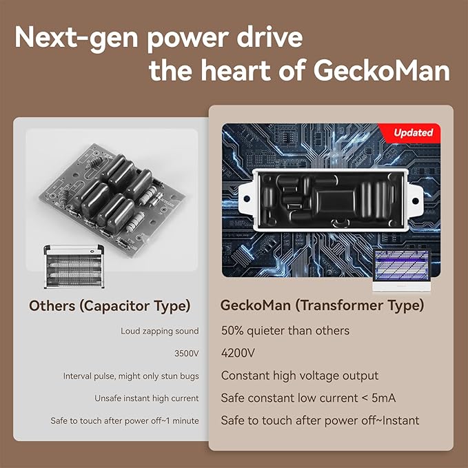 - 【⚡ More Powerful】Next generation power drive module generates and maintains a constant 4200V zapping power. Higher bug killing rate compared to other mosquito zappers (capacitor type) that can only generate interval zapping.
