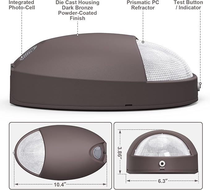 - 💡【Die-Casting Aluminum Housing&Durable Backup】The exterior emergency wall light fixtures made of die cast aluminum housing with the durable dark bronze powder-coated finish deliver a professional look. The housing is sealed and gasketed for even better protection,suitable for wet locations, up to 50,000 hours rated life. Specifications: 120V-277V universal voltage, Photocell & Wall Switch Operation, Self-diagnostics,Backup Battery,Test switch and indicator.