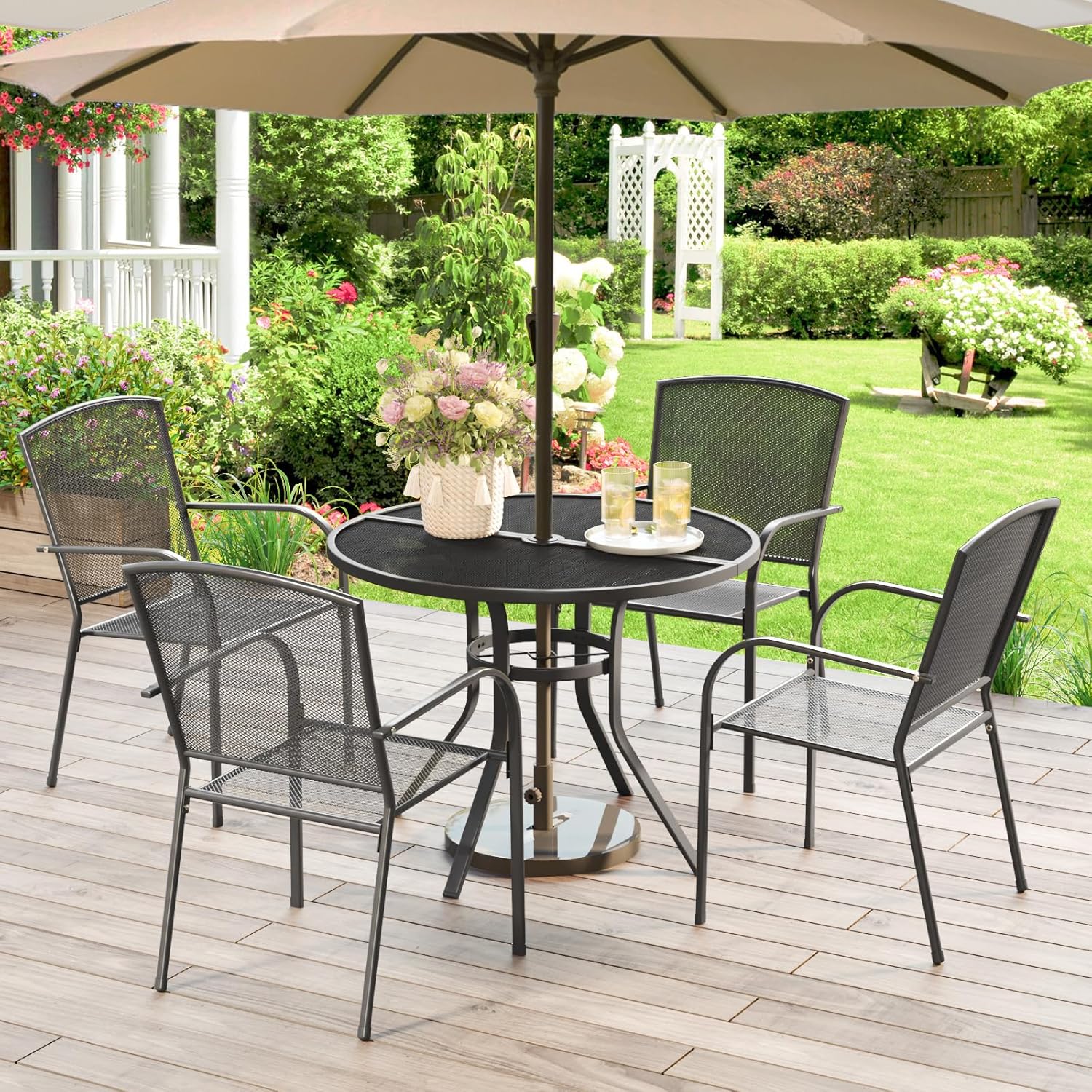 - ăFits In Anywhereă - Our stylish outdoor patio dining table will complement any backyard arrangement or landscaping theme. Itâs a great fit for outdoor yards, gardens, lawns, and poolsides.