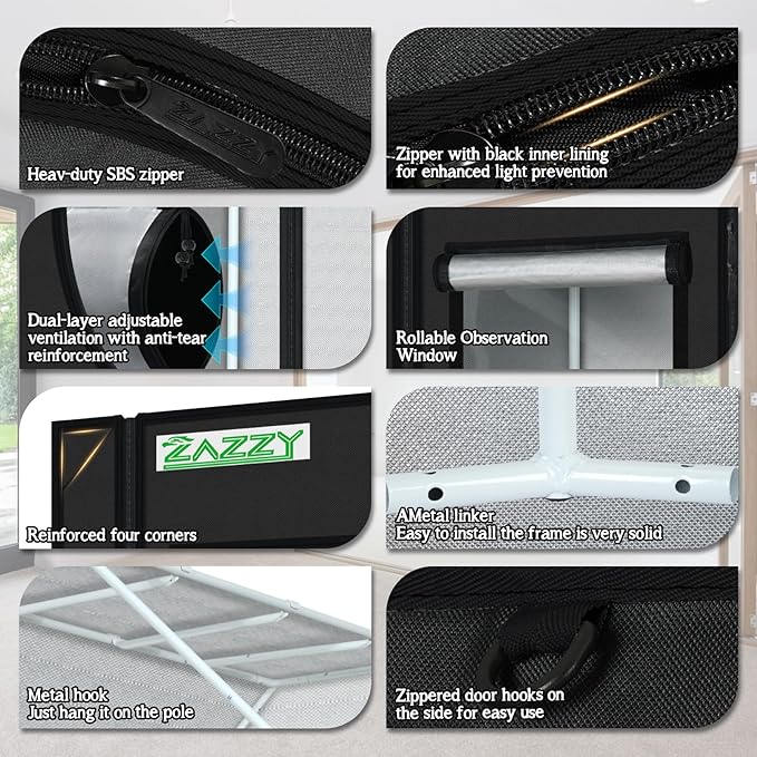 - Top-Quality Materials and Sturdy Frame---Zazzy plant grow tent made of superior quality reflective 600D mylar and double stitched to ensures the light blocking. Heavy duty all steel poles which are rated to handle at least 110 lbs. The frame is specially finished to ensure smooth installation and safe handling.