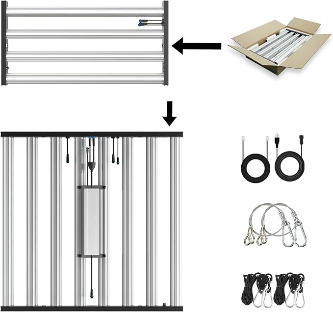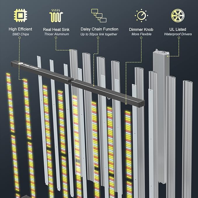 - NO NEED CONTROLLER DAISY CHAIN- Innovative easy daisy chain dimming function, no need to buy controllers, just use the daisy chain to link all the lights, then dimmable one light , all lights follow. Up to 50pcs lights can be connected together. Unfold to use, no installation need. 1PCS Perfect for 4x4ft 5x5ft 6x6ft 7x7ft coverage,up to 7.2*7.6ft growing area in Veg stage and 7*7ft for flower stage.