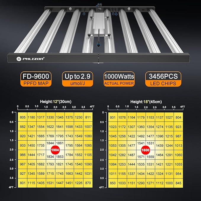 - USED WITH LEDS MAXIMIZE YIELD - The FD9600 series grow light use with LM281B led Chips 3456pcs high efficient SMD leds,boast the market-leading efficiency to 2.9 ยตmol/J and 2.5g yield per wattage with 30% higher Average PPFD, the actual power is 1000 watt.