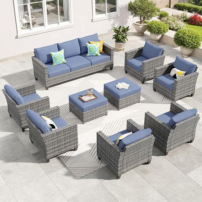 - 11 Seats Furniture: Ottomans can be combined the 3-seats sofa, couch or single chair into a chaise, it can also be used as a coffee table and side table for outside. OVIOS 9-pieces outdoor patio furniture set comes with all hardware & necessary tools