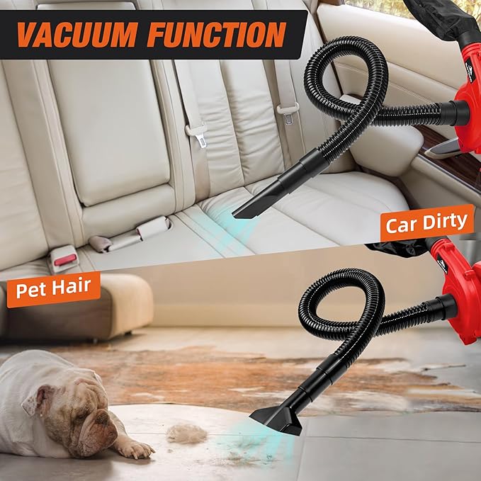 - 【2-in-1 Blower & Vacuum】 2 in 1 design makes electric leaf blower & vacuum can be switched at will, just enjoy the flexibility and versatility of this cordless leaf blower. It’s not only a leaf sweeper, but also a multifunctional dust & pet hair cleaner, car blower, inflator for camping,boating or floating,also awesome for getting all the air out.