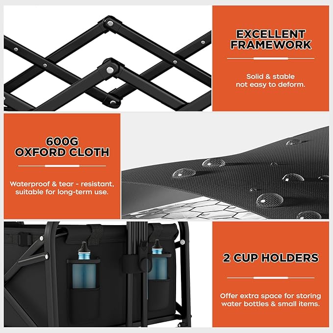 - Large Capacity:Our folding wagon is designed to be widened and deepened.The large storage space of the lounge wagon can accommodate all your items such as toys, garden tools and tents. It also has 2 mesh cup holders to keep your drinks safe.