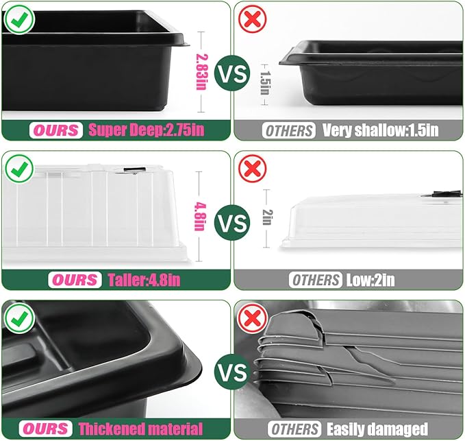 - 【Extra-Tall 5" Humidity Domes for Stronger Seedlings】Our seed starter kit features 5-inch high domes that securely hold small nursery pots during transport. Acting like a mini tabletop greenhouse, it's perfect for seed starting, seedling propagation, mushroom growing, and container gardening. Give your plants a cozy, protected home and watch them thrive!