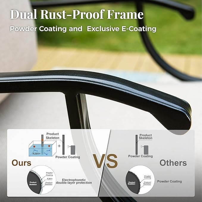 - 【RELIABLE ALL-WEATHER METAL CONSTRUCTION】Built from durable metal with E-COATING and POWDER-COATING finish, ensuring resistance to all weather conditions, rust-proof qualities, and easy maintenance. The sturdy wrought iron frame can withstand various weather conditions, with the single chairs supporting up to 350 lbs and the 3-seater sofa accommodating up to 900 lbs, promising long-lasting reliability and durability